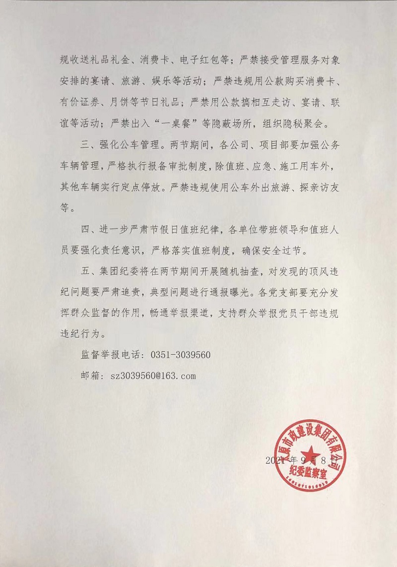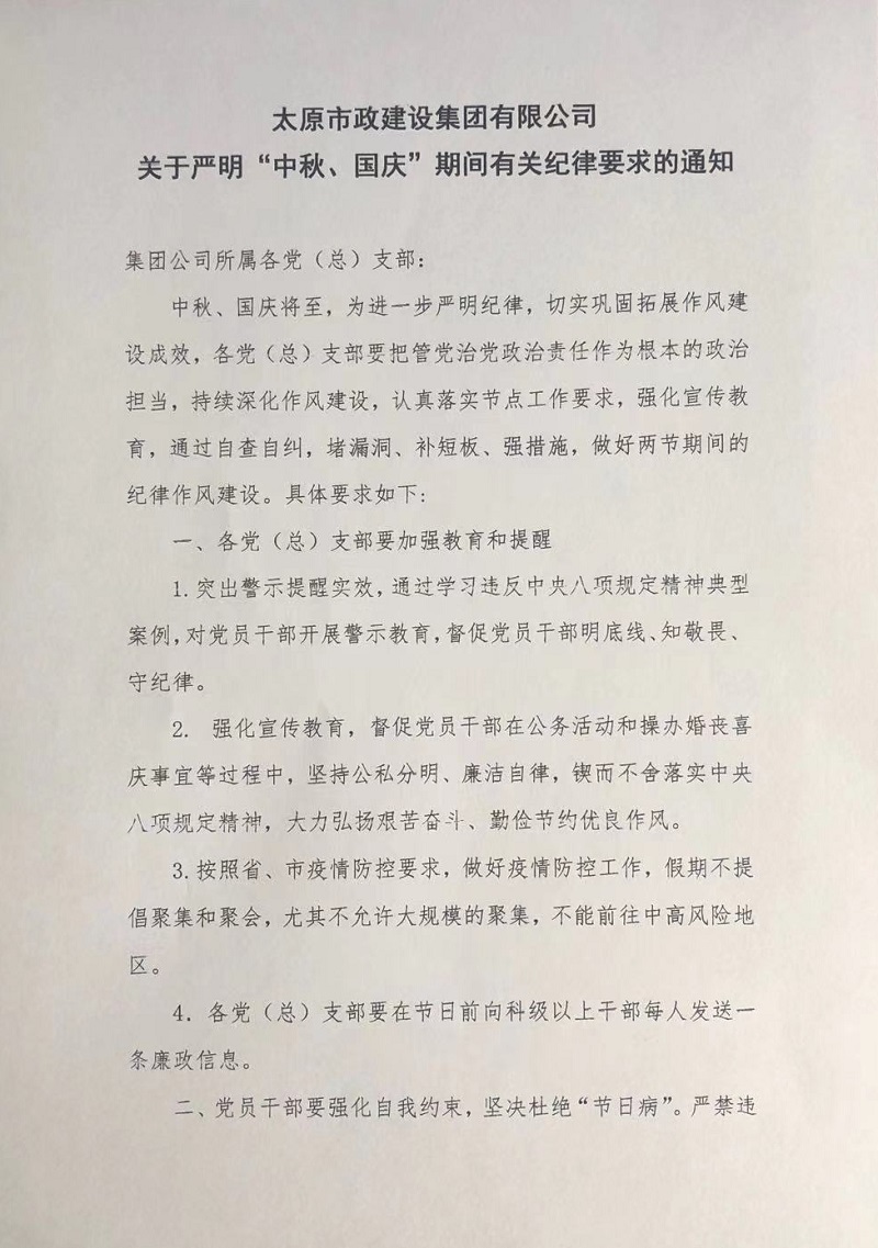 太原市政建設(shè)集團(tuán)有限公司關(guān)于嚴(yán)明“中秋、國(guó)慶”期間有關(guān)紀(jì)律要求的通知