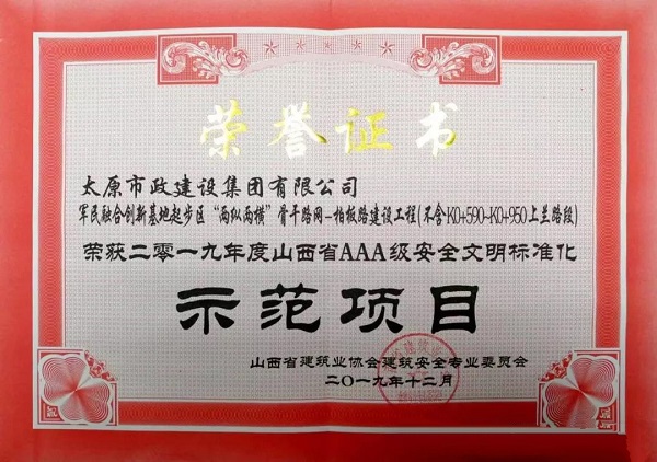 2019年12月25日,由集團公司承建的“軍民融合創(chuàng)新基地起步區(qū)‘兩縱兩橫’骨干網絡—柏板路建設工程(不含K0+590-K0+950上蘭路段)”榮獲山西省建筑業(yè)協(xié)會建筑安全專業(yè)委員會頒發(fā)的“2019年度山西省AAA級安全文明標準化示范項目”榮譽稱號。