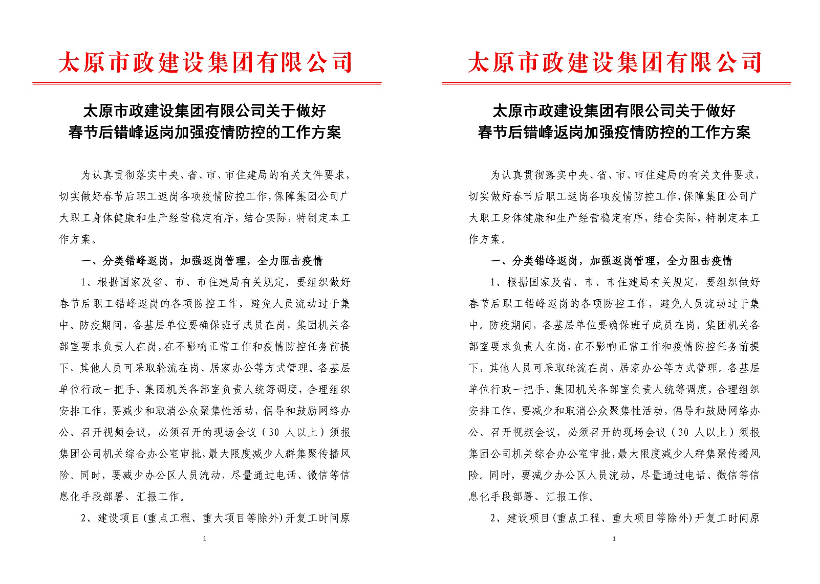 統(tǒng)一指揮,確保領(lǐng)導(dǎo)組織到位。為有效應(yīng)對新冠肺炎疫情,集團(tuán)公司迅速制定《太原市政建設(shè)集團(tuán)有限公司新型冠狀病毒防控應(yīng)急預(yù)案》,成立集團(tuán)公司新型冠狀病毒感染的肺炎疫情防控工作領(lǐng)導(dǎo)小組,以強(qiáng)有力的領(lǐng)導(dǎo)統(tǒng)籌協(xié)調(diào)推進(jìn)集團(tuán)公司疫情防范和處置工作。同時(shí),集團(tuán)公司制定《太原市政建設(shè)集團(tuán)有限公司關(guān)于做好春節(jié)后錯(cuò)峰返崗加強(qiáng)疫情防控的工作方案》,對職工復(fù)工前以及返程中個(gè)人防護(hù)、網(wǎng)上辦公等事項(xiàng)作出詳細(xì)安排和明確要求,保障集團(tuán)公司廣大職工身體健康和生產(chǎn)經(jīng)營穩(wěn)定有序。